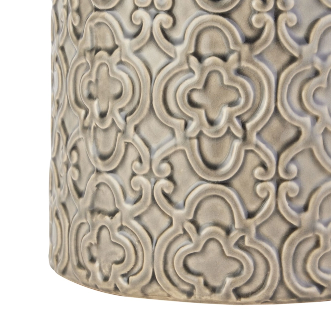 Handcrafted in ceramic, this Seville Collection Large Grey Marrakesh Urn is a stylish and contemporary jar with removable lid. The bold and distinctive raised pattern that wraps itself around the barrel of this opulent jar is glazed a versatile grey tone. This striking jar would look elegant styled on its own or fabulous displayed as a pair with the smaller sized version we also carry (22604).
